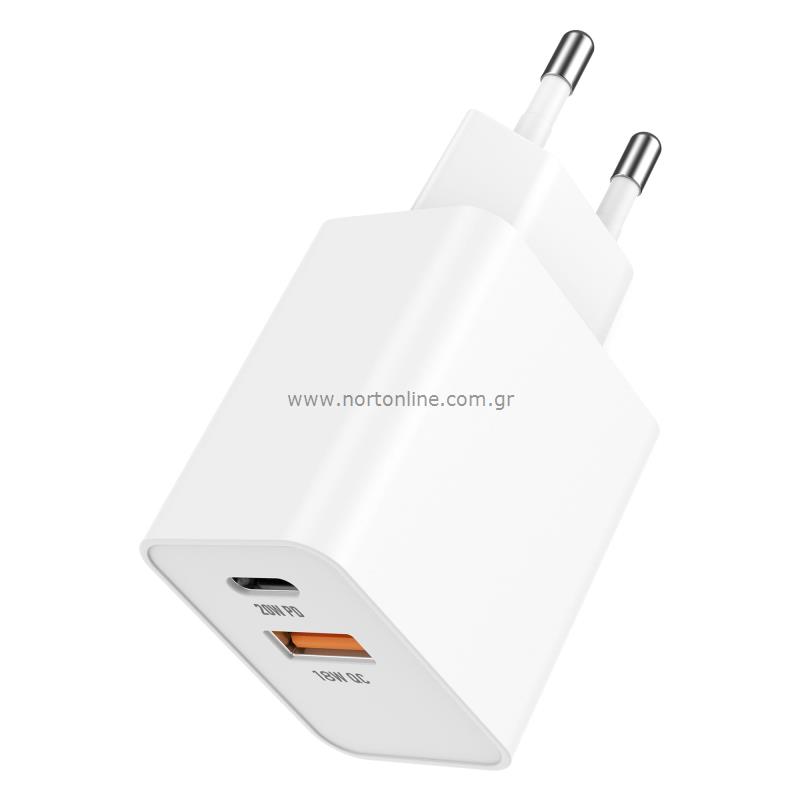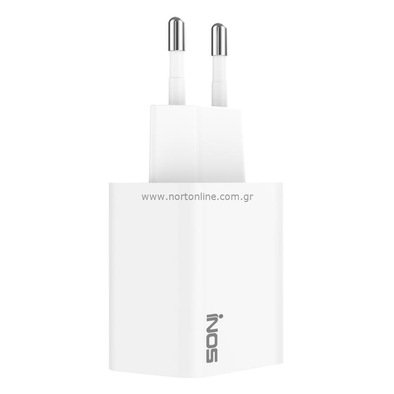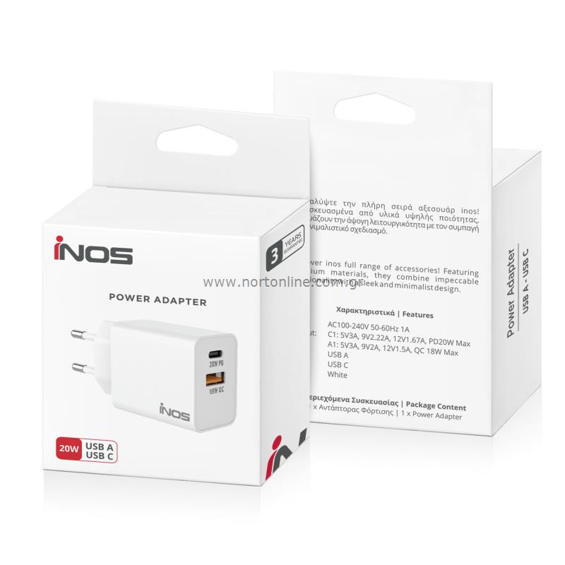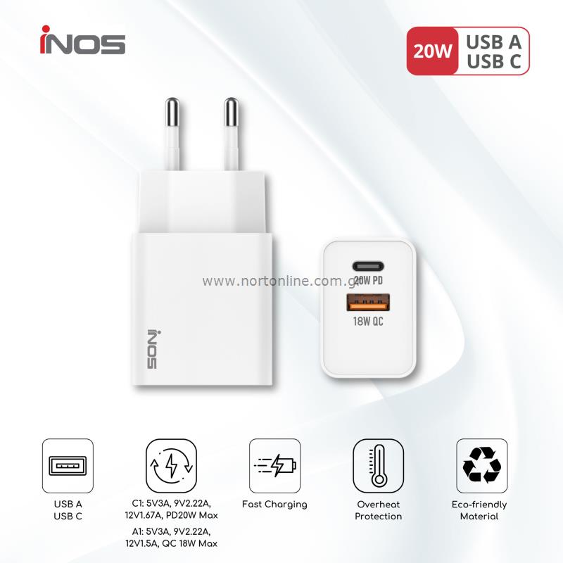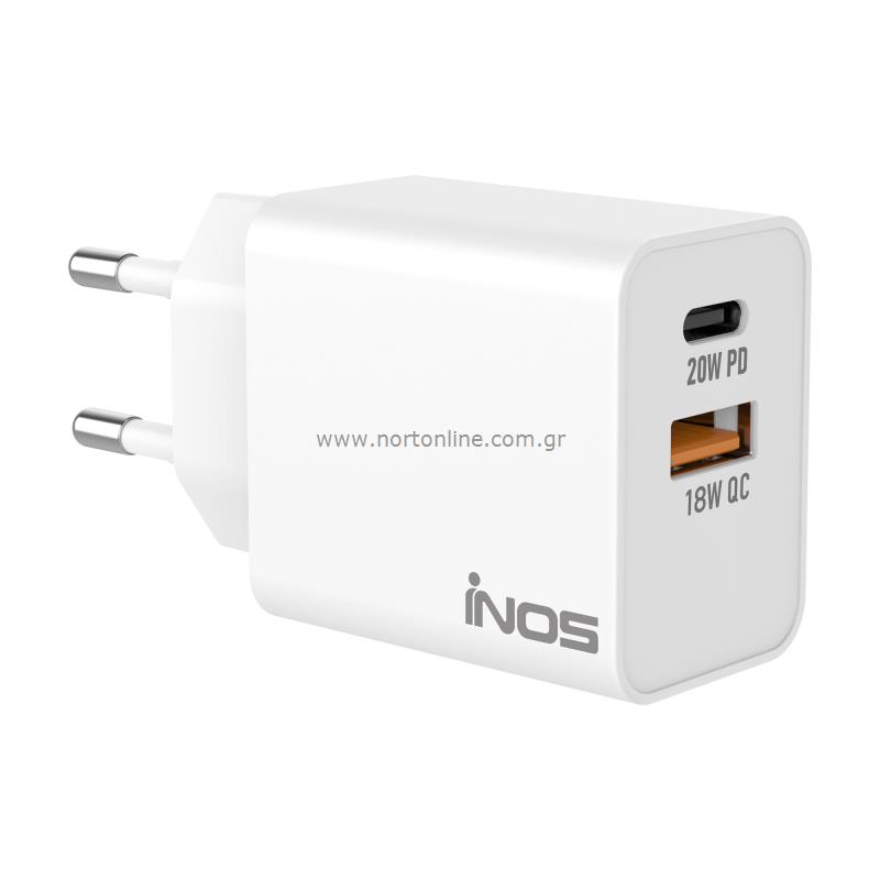 Φορτιστής Ταξιδίου Ταχείας Φόρτισης inos με διπλή έξοδο USB A & USB C PD 20W. Πρόκειται για έναν ασφαλή και αξιόπιστο φορτιστή ταξιδίου που παρέχει προστασία από υπερθέρμανση, υπερφόρτιση, υπερβολική τάση και βραχυκύκλωμα. Χάρη στην τεχνολογία PD επιτυγχάνεται ταχύτερη φόρτιση σε σχέση με τους συμβατικούς φορτιστές ενώ παράλληλα γίνεται άμεση αναγνώριση της συσκευής, ρυθμίζοντας την έξοδο τάσης για βέλτιστη φόρτιση. Διαθέτει προσεγμένο σχεδιασμό, κατασκευή από ποιοτικά υλικά ενώ ο συμπαγής σχεδιασμός του, καθιστά εύκολη τη μεταφορά του. Μπορεί επίσης να φορτίσει συσκευές που δεν υποστηρίζουν ταχεία φόρτιση στην κανονική τους ταχύτητα (έως 5 Volt / 3Α).