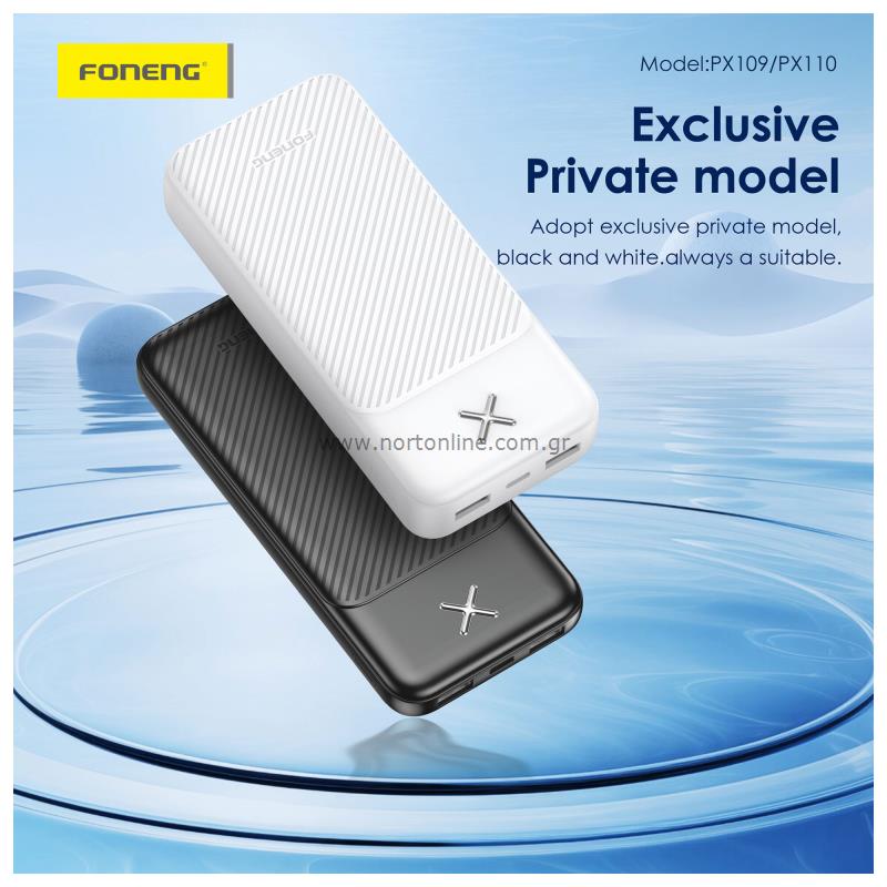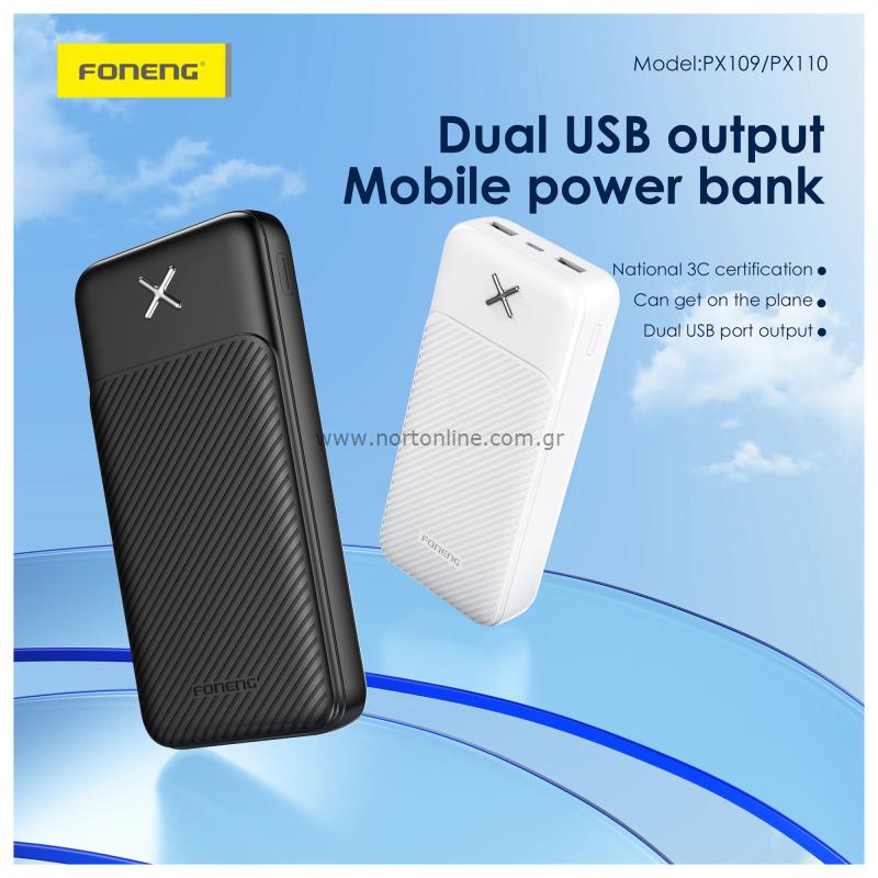 Το Foneng PX110 είναι ένα συμπαγές power bank 20000mAh σχεδιασμένο για καθημερινή φόρτιση. Διαθέτει δύο εξόδους USB A (5V/2.1A η καθεμία) και μία είσοδο USB C που υποστηρίζει 5V/2A. Μια ενδεικτική λυχνία LED δείχνει με μια ματιά το επίπεδο της μπαταρίας που απομένει. Με διαστάσεις 146x68x30mm, είναι εύκολο στη μεταφορά. Κατασκευασμένο με προστασία ασφαλείας από υπερφόρτιση, υπερβολικό ρεύμα και βραχυκύκλωμα, το PX109 προσφέρει αξιόπιστη και αποδοτική τροφοδοσία εν κινήσει.