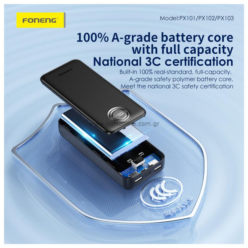 Το Foneng PX102 είναι ένα power bank 20000 mAh με γρήγορη φόρτιση 22.5W σε τρεις θύρες εξόδου. Η είσοδος USB C υποστηρίζει 5V/3A και 9V/2A, ενώ οι έξοδοι περιλαμβάνουν μια θύρα USB C (PD) και δύο θύρες USB A με συνδυασμένη γρήγορη έξοδο. Έχει διαστάσεις περίπου 145x70x30mm και ζυγίζει 420g. Διαθέτει οθόνη LCD για την κατάσταση της μπαταρίας και είναι πιστοποιημένο σύμφωνα με το πρότυπο ασφαλείας 3C.