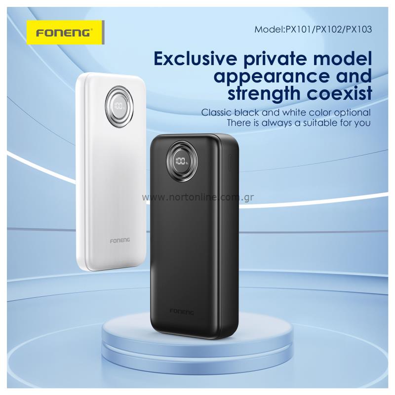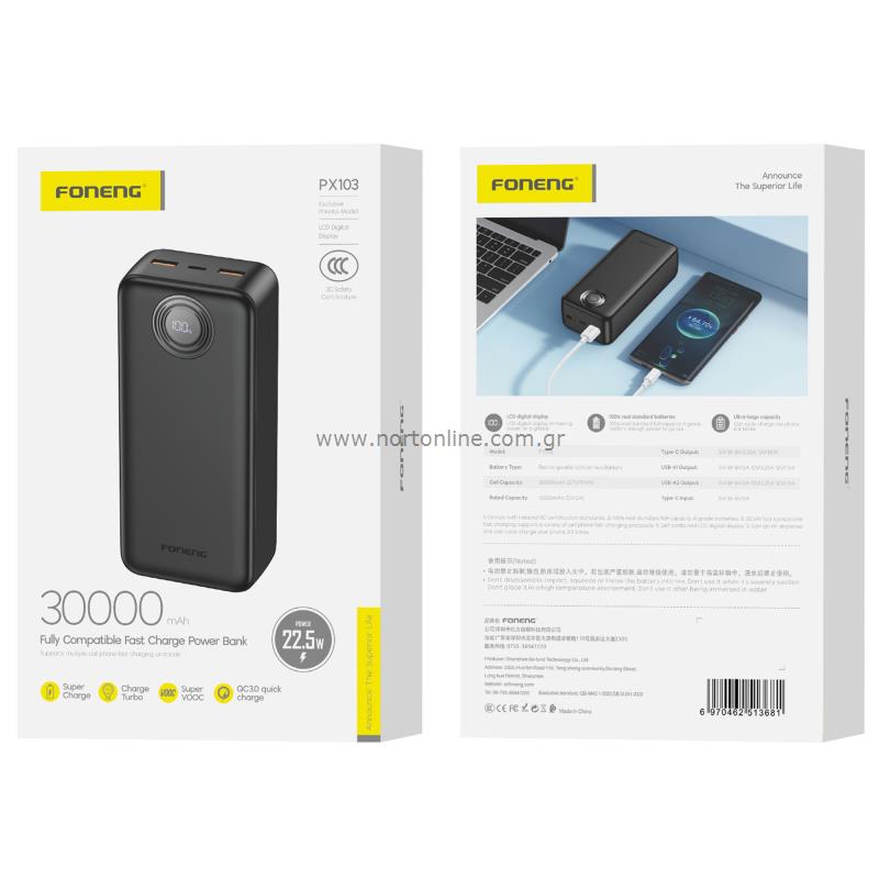 Το Foneng PX103 είναι ένα power bank 30000 mAh με γρήγορη φόρτιση 22.5W σε τρεις θύρες εξόδου. Η είσοδος USB C υποστηρίζει 5V/3A και 9V/2A, ενώ οι έξοδοι περιλαμβάνουν μια θύρα USB C (PD) και δύο θύρες USB A με συνδυασμένη γρήγορη έξοδο. Έχει διαστάσεις περίπου 145x70x50mm και ζυγίζει περίπου 600g. Διαθέτει οθόνη LCD για την κατάσταση της μπαταρίας και είναι πιστοποιημένο σύμφωνα με το πρότυπο ασφαλείας 3C.