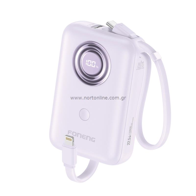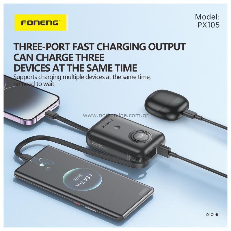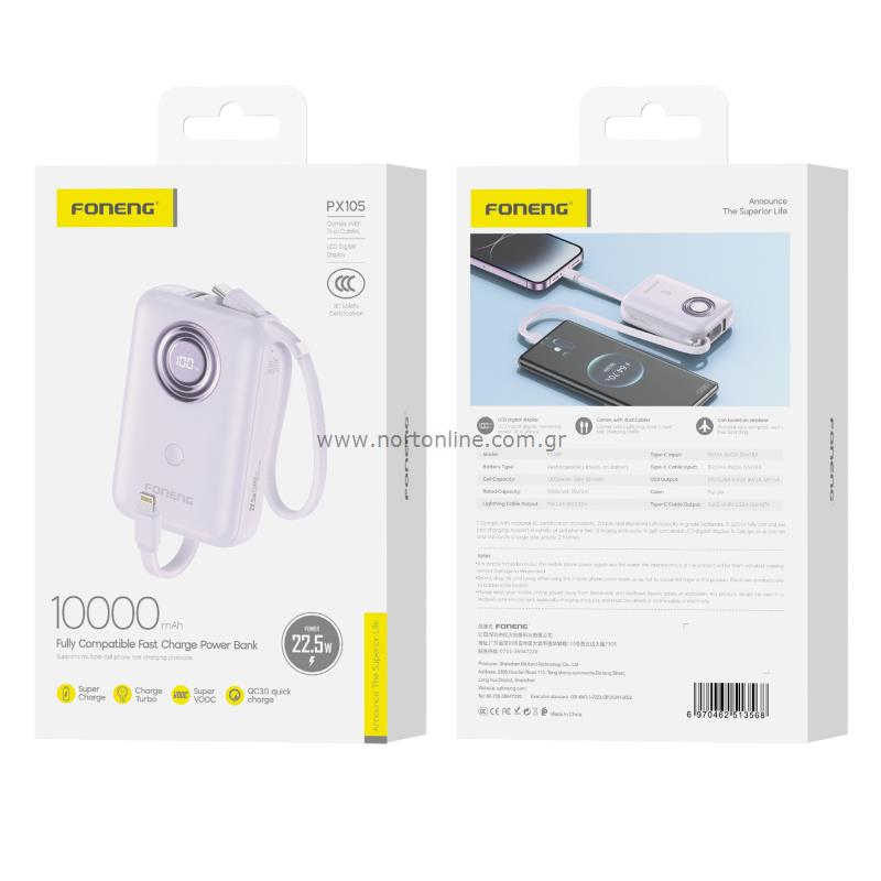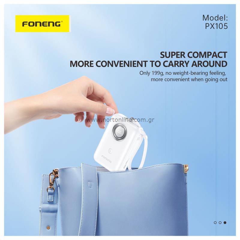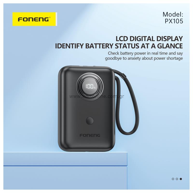 Το Foneng PX105 Mini Power Bank διαθέτει χωρητικότητα 10000 mAh σε συμπαγή μορφή. Υποστηρίζει γρήγορη φόρτιση 22.5 W και διαθέτει δύο ενσωματωμένα καλώδια (USB C + Lightning) για τη φόρτιση συσκευών χωρίς επιπλέον καλώδια. Η είσοδος στη θύρα USB C έχει ονομαστική τιμή 5V/2A, 9V/2A, 12V/1,5A. Οι έξοδοι περιλαμβάνουν USB A και τα ενσωματωμένα καλώδια, παρέχοντας διαφορετικές τάσεις γρήγορης φόρτισης. Το μέγεθός του είναι περίπου 90x60x25 mm και ζυγίζει 220 g. Μια ενσωματωμένη οθόνη LCD δείχνει το υπόλοιπο επίπεδο της μπαταρίας σε πραγματικό χρόνο.