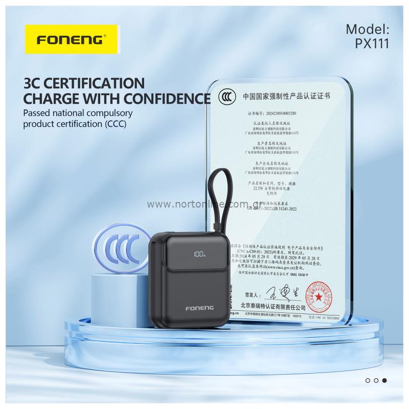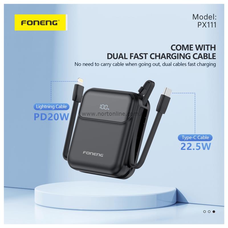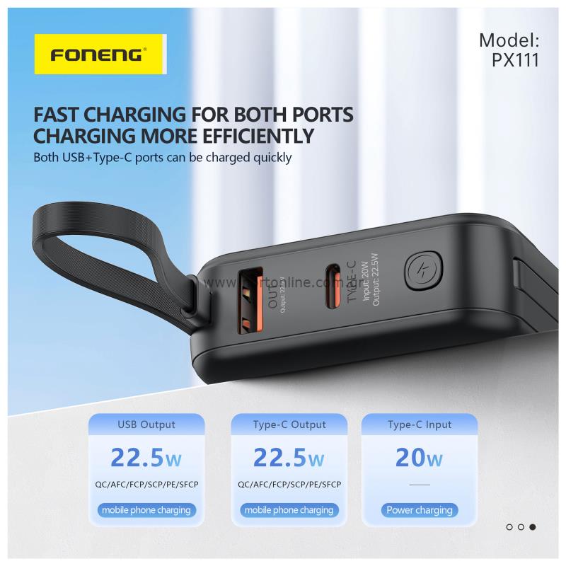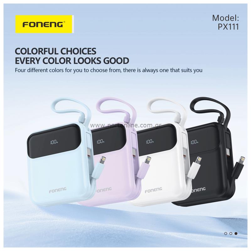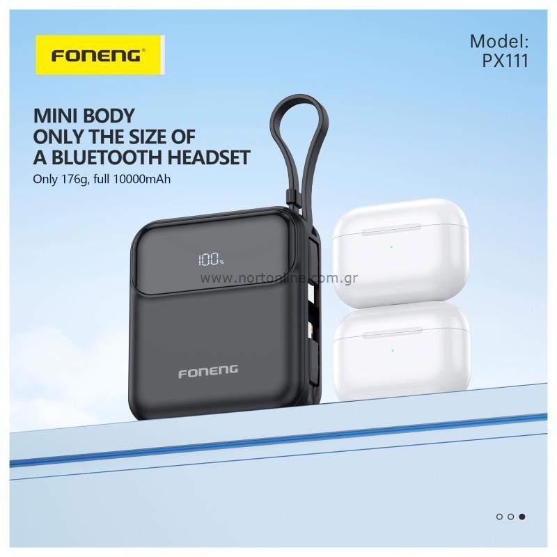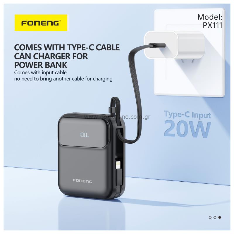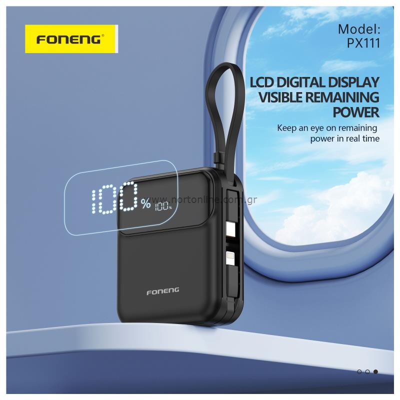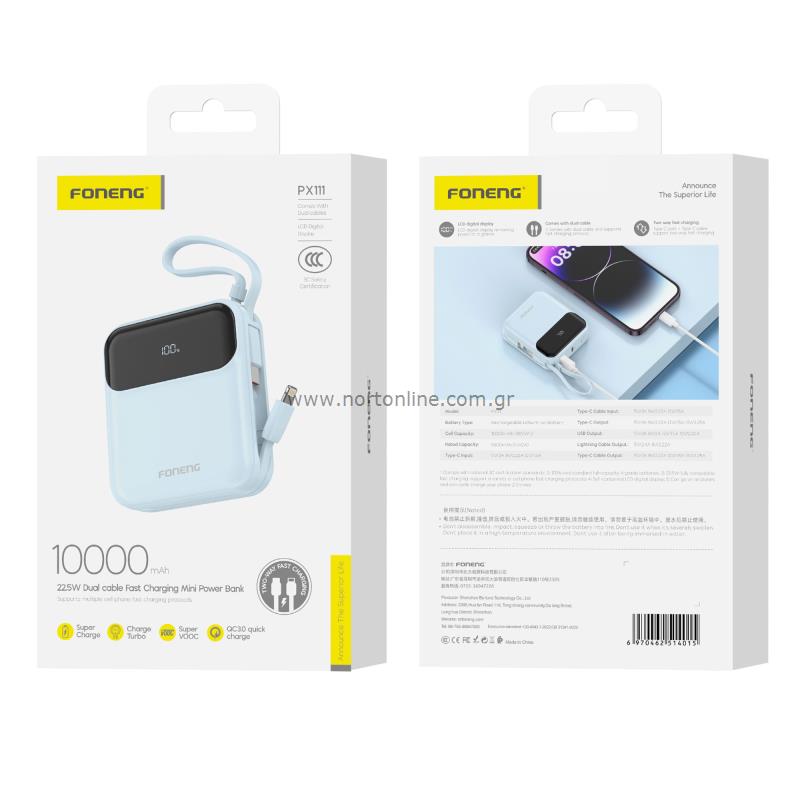 Το Foneng PX111 είναι ένα συμπαγές μίνι power bank 10000 mAh με γρήγορη φόρτιση 22.5 W και δύο ενσωματωμένα καλώδια (USB C + Lightning). Οι διαστάσεις του είναι περίπου 74,92x66,17x24 mm. Υποστηρίζει πολλαπλές τάσεις εξόδου για γρήγορη και αποδοτική φόρτιση. Αυτό το καθιστά ιδανικό για ταξίδια ή καθημερινή χρήση, όταν θέλετε να φορτίζετε χωρίς να μεταφέρετε ξεχωριστά καλώδια.