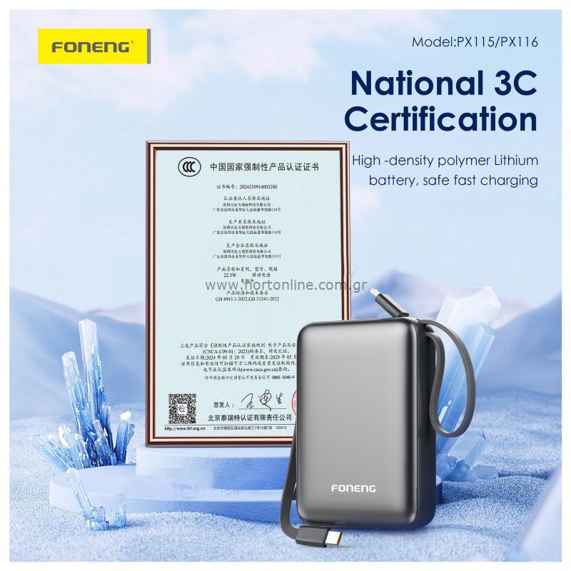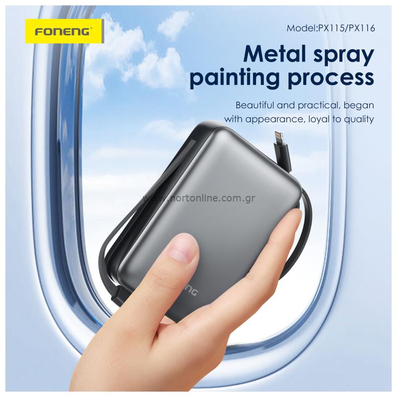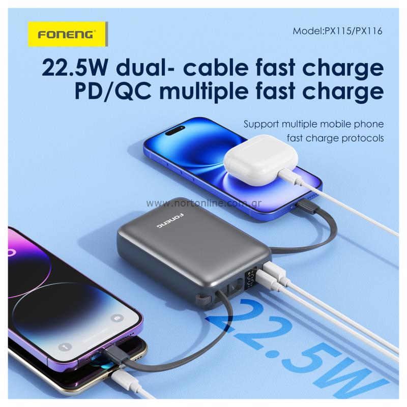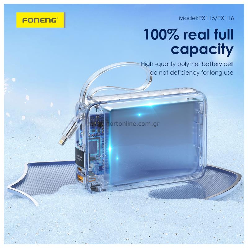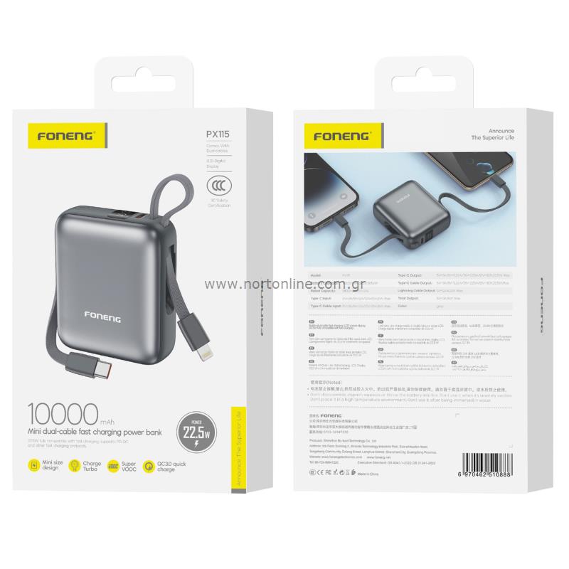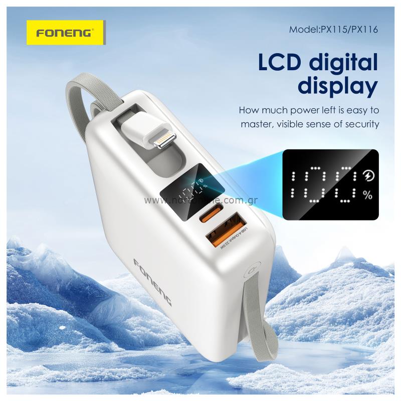 Το Foneng PX115 είναι ένα συμπαγές mini power bank 10000 mAh που υποστηρίζει γρήγορη φόρτιση 22.5W. Περιλαμβάνει δύο ενσωματωμένα καλώδια (USB C + Lightning) για εύκολη φόρτιση χωρίς επιπλέον καλώδια. Μια οθόνη LCD δείχνει το επίπεδο της μπαταρίας σε πραγματικό χρόνο. Οι διαστάσεις του είναι περίπου 73x63.5x26.4 mm και το καθαρό βάρος του είναι περίπου 174g.