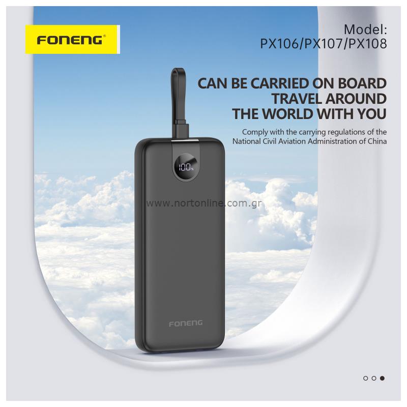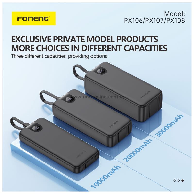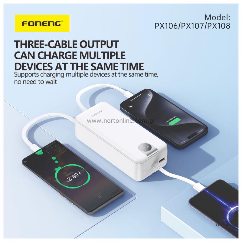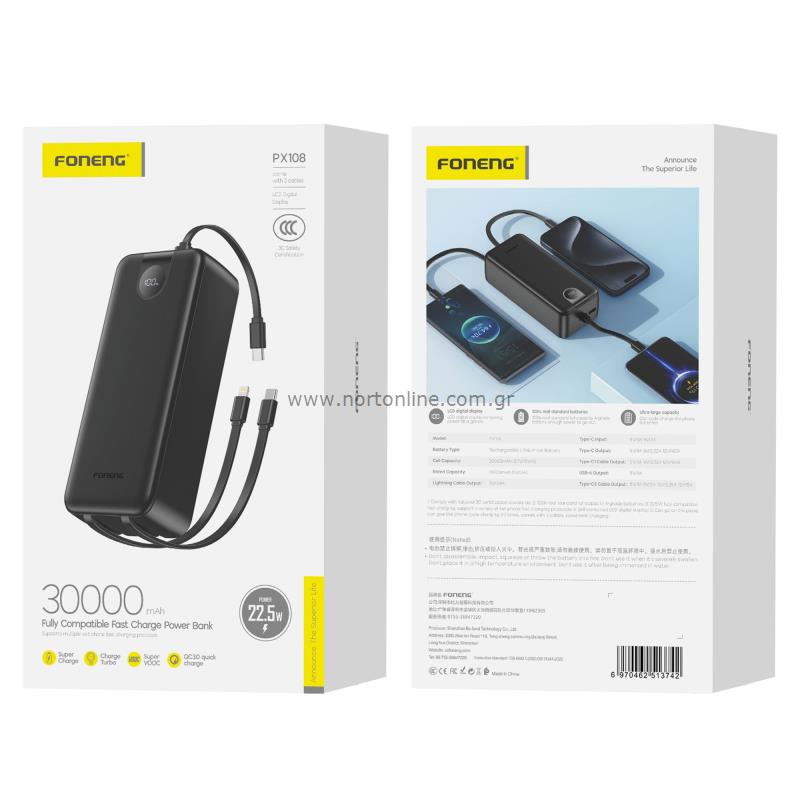 Το Foneng PX108 είναι ένα power bank 30000 mAh με γρήγορη φόρτιση 22.5W και τρία ενσωματωμένα καλώδια (δύο USB C + ένα Lightning) για εύκολη φόρτιση χωρίς επιπλέον καλώδια. Διαθέτει ψηφιακή οθόνη LCD που δείχνει το υπόλοιπο ποσοστό της μπαταρίας. Οι διαστάσεις του είναι 151,6x66,7x42,6 mm και το καθαρό βάρος του είναι περίπου 617,2g. Η είσοδος είναι 5V/3A και 9V/2A, ενώ οι έξοδοι (μέσω USB A ή των ενσωματωμένων καλωδίων) υποστηρίζουν διάφορα προφίλ γρήγορης φόρτισης, συμπεριλαμβανομένων των PD και PPS.