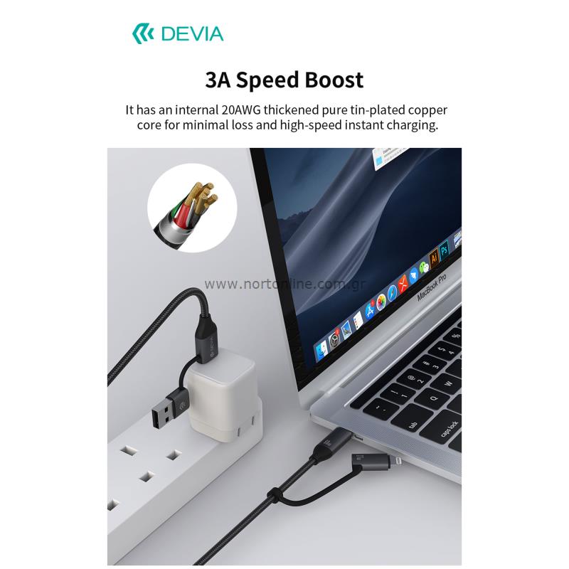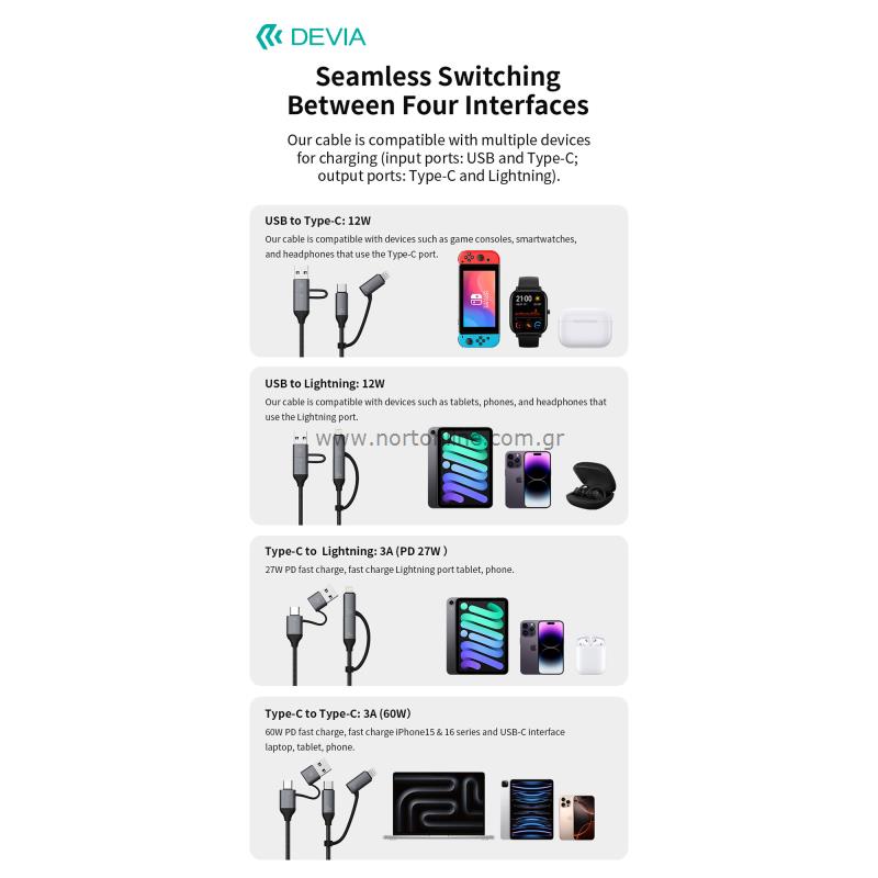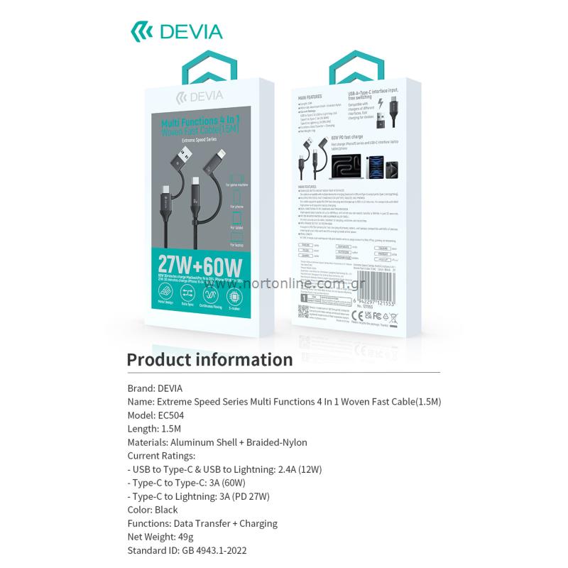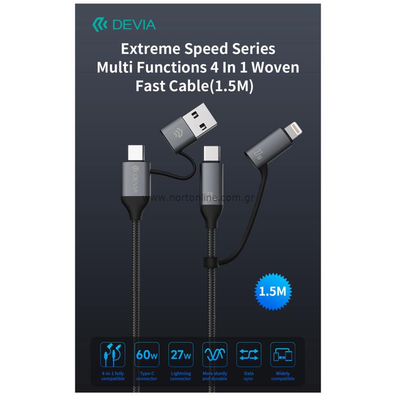 Καλώδιο Σύνδεσης USB 2.0 4in1 Braided Devia EC504 USB C σε USB A & USB C & Lightning PD 27W+60W 1.5m Extreme Μαύρο