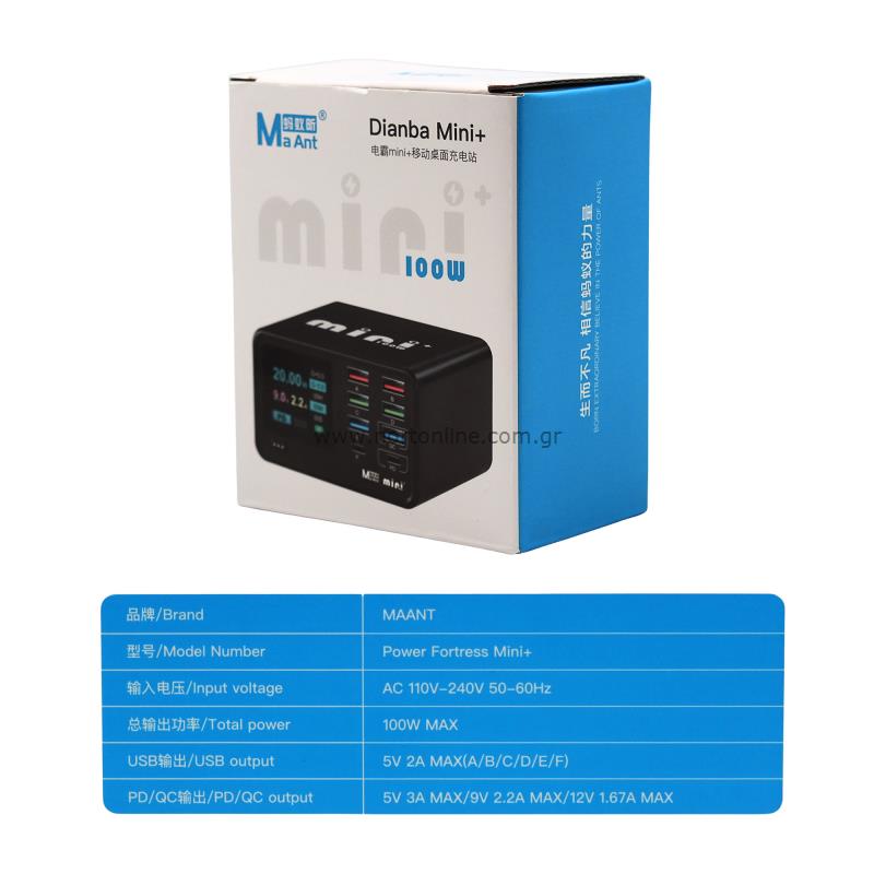 Η Συσκευασία Περιλαμβάνει:1 x Πολυφορτιστής Πάγκου MaAnt DianBa Mini+ PD/ QC με 8 Θύρες USB A & USB C 100W & Οθόνη Ενδείξεων