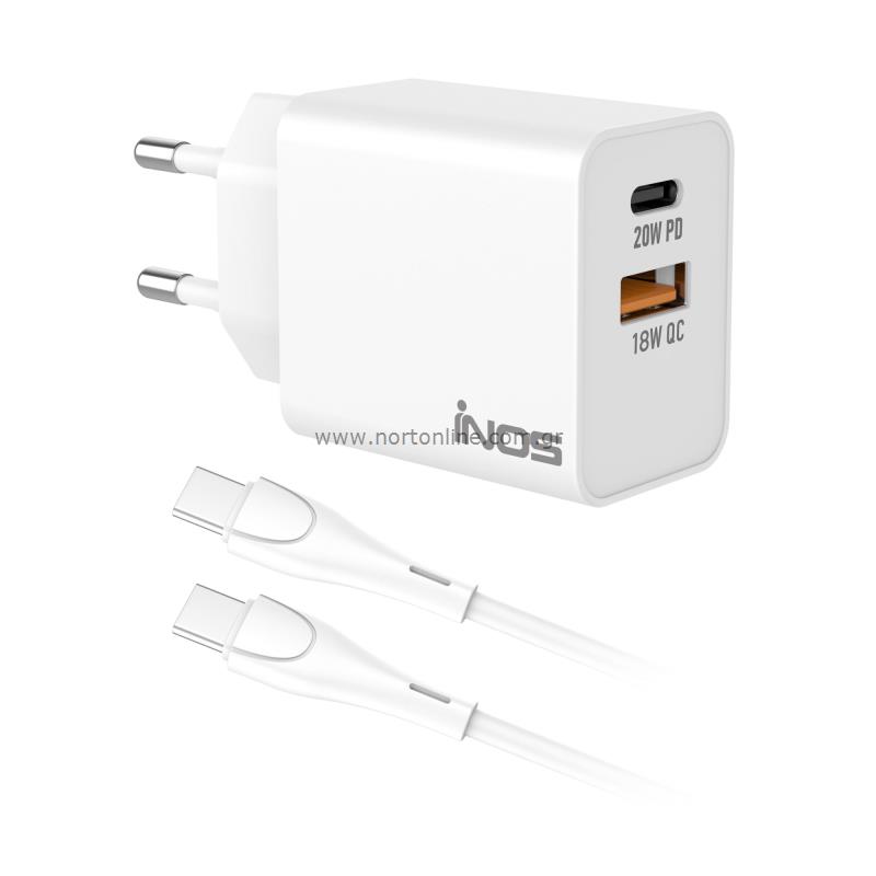 inos Quick Charge Travel Charger with USB C Output PD 20W. It is a safe and reliable travel charger that provides protection against overheating, overcharging, over voltage and short circuit. Thanks to PD technology it allows you to charge faster than conventional chargers, while at the same time the device is immediately recognized, adjusting the voltage output for optimal charging. It has a careful design, made of high-quality materials, while its compact design makes it very easy to transport. It can also charge devices that do not support fast charging at their normal speed (up to 5 Volts / 3A). It comes with an inos USB C cable that allows you to exchange data and keep your files always with you!